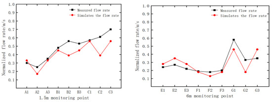 There are many factors beyond the researcher’s control in field measurements, such as pedestrian interference, the accuracy of the measured street canyon, and other road facilities that will affect the accuracy of the measured results; also, the size and accuracy of the model in the simulation scheme cannot be compared with the actual street canyon. The size of the simulation scheme is exactly the same, so there is a certain disparity between the results of the simulation scheme and the measured values in the field. It was observed that the average errors of the overall monitoring surface at a height of 1.5 m and 6 m are 0.9 and 0.7, respectively, and the corresponding average error percentages are 22% and 25%, respectively. The maximum error velocity is C2 and G2 on the windward side, respectively. The monitoring points are 0.15 and 0.21, respectively, and the corresponding error percentages are 34% and 45%, respectively.