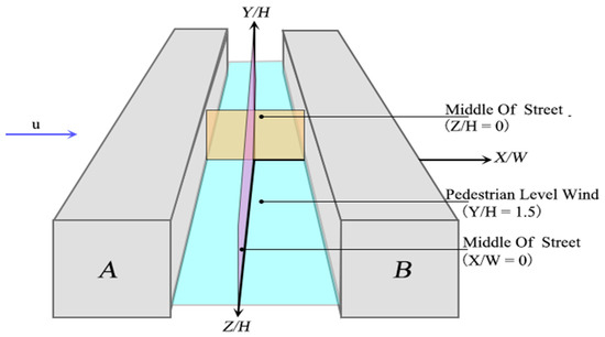 The flow velocity values of the plane streamline diagram and the three-dimensional flow field diagram at Z/H = 0 m, X/W = 0 m, and pedestrian breathing height Y/H = 1.5 m in the middle of different types of street canyons were extracted (Figure 8), and after comparative analysis Obtain the distribution trend of the airflow field in the empty street canyon.