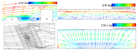 It can be seen from the plane streamline diagram at X/W = 0 m that that part of the airflow flows out of the street canyon from both ends of the roof, while the flow velocity increases continuously and reaches the maximum value on both sides. Another part of the airflow travels from the middle to the ground at both ends. The airflow tends to decrease at first and then increase, forming a static wind area on the roof of Building A, after which the flow velocity increases continuously and the flow velocity increases as it moves closer to the ground.