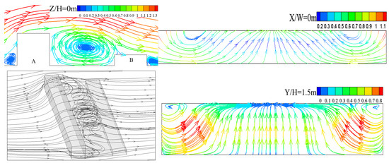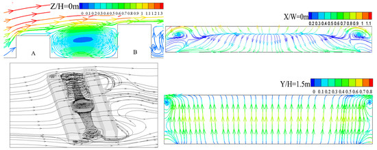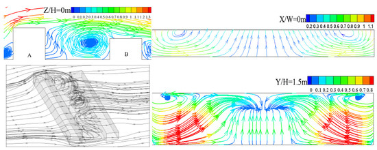 It can be seen from the plane streamline diagram at X/W = 0 m that part of the airflow flows out of the street canyon from the direction of the roof; then, the flow velocity increases continuously and reaches the maximum value. The other part of the airflow flows from the middle to the ground at both ends; the closer it is to the ground, the smaller the flow velocity, and a static wind area is formed near the ground.