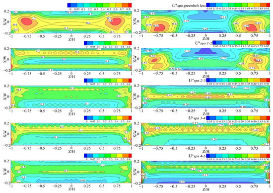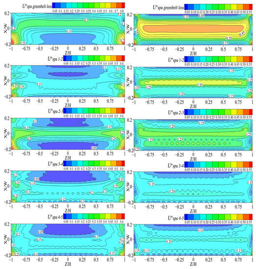 It can be seen from Figure 10 that when ASF = 1/3 (on the left side of the figure), after the green belt is set, the airflow velocity on the back side is lower than that on the windward side; the low-value area of the velocity at both ends of the leeward side disappears and appears on the leeward side and near the middle. A low-value area of flow velocity is formed nearby, and the flow velocity at both ends of the windward side reaches the maximum value. The specific manifestations are as follows: (1) the maximum flow velocity area is near the two ends of the windward side of the street canyon (Z/H = ±1, X/W = −0.2). The distribution range with a normal flow velocity of 0.5–0.8 decreases with the increase in the green belt, and the distribution range is the largest for Spa2-3. (2) The minimum flow velocity area is located on the leeward side of the street canyon (Z/H = ±0.5, X/W =-0.2). Spa2-3 has an additional windward side (Z/H = ±0.5, X/W = −0.2), while the distribution range of the normalized flow velocity at ≤ 0.05 increases with the increase in the green belt, while the leeward side continues to increase, with the largest distribution in the form of Spa2-3.