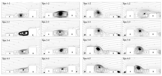 It can be seen from Figure 12 that the reason for the difference is that when the step-up street canyon ASF = 1/3, the green belt causes the turbulence at the roof of Building A to sink on the leeward side, increasing the airflow infiltrating into the middle, while the airflow at both ends is affected by the green belt. After blocking, the airflow to the interior of the street canyon and the windward side is reduced, so extreme airflow areas are formed near the leeward side and the windward side of the two ends, which are most evident in the scenario of Spa4-5; as the building height on the leeward side rises, the ASF rises to At 2/3, the turbulence at the roof is reduced by the sinking flow intensity on the B side of the building, and the increase in green belts weakens the airflow traveling into the middle of the street canyon at both ends, resulting in the infiltrating airflow no longer having enough potential energy to flow from the windward side. The side vortex moves to the leeward side, causing the center of the vortex to gradually shift to the windward side, forming a low-velocity area in the middle of the street and near the leeward side, causing the overall airflow velocity on the leeward side to be lower than that on the windward side.