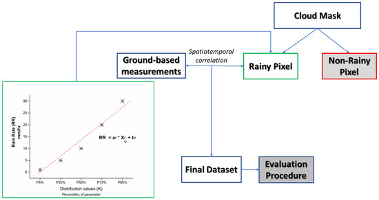 More analytically, the set of criteria that define the rainy pixels actually delineate a distribution of pixels in each different timeslot of the Meteosat multispectral imagery and for each different parameter. This means that the algorithm uses six different distributions of values related to the BTs of the 6.2, 7.3, 8.7 and 10.8 μm channels as well as the differences BTD6.2μm–7.3μm, and BTD10.8μm–12.0μm in each different timeslot (every 15-min). Then, the values of the percentiles 5%, 25%, 50%, 75% and 95% (P5%, P25%, P50%, P75%, P95%, respectively) for each parameter, are calculated. The next step is these values being linked with representative RR values and creating five different pairs of data which are used to calculate the least square equations for the six different parameters. The RR values are standard [43] and are based on the general theoretical concept that lower BT (and BTD) are linked with higher RR values as the cold/opaque cloud tops depict convective cloud patterns where heavy rainfall usually occur [39,40,41,42]. More specifically, for every different timeslot, the value of P5% for each parameter is linked with the RR = 1 mm/h, the value of P25% for each parameter is linked with the RR = 5 mm/h, the value of P50% for each parameter is linked with the RR = 10 mm/h, the value of P75% for each parameter is linked with the RR = 20 mm/h and the value of P95% for each parameter is linked with the RR = 30 mm/h. In this way, five pair of values for each parameter are used to calculate all the relative least square linear equations. Subsequently, the difference between the pixel value of the above-mentioned parameters and their relative quartiles of P25%, P50%, P75% (coming from the distribution of the pixel values that consist of the relative cloud pattern) are used to yield the RR estimation from the relative linear equation. More specifically, the minimum difference (Equation (1)) defines the linear equation/parameter that is the most representative and appropriate, which is finally used to provide the RR estimation (Equation (2)) on a pixel basis.