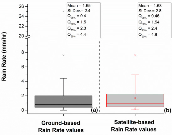 Boxplot of the distribution of the rain rate values of (a) the dataset formed by the rainy measurements of the ground-based meteorological stations for the year 2019, used for the satellite algorithm evaluation and (b) the satellite-based rain rate estimations made by the satellite algorithm.