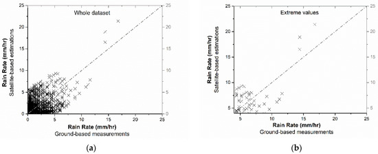 Rain Rate comparisons between ground-based measurements and satellite-based estimations for (a) the whole rainy dataset (2303 pairs of values) and (b) the higher 10% (Q90%) of the distribution of RR values.
