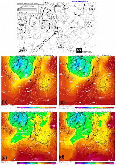 Synoptic conditions on the examined day (26 May 2020). (a) Surface weather map on 26 May 2020 (00:00 UTC). Geographical distribution of: the 500 hPa geopotential height and sea-level pressure at 06:00 and 12:00 UTC (b,c) and the 850 hPa geopotential height and air temperature at 06:00 and 12:00 UTC (d,e).