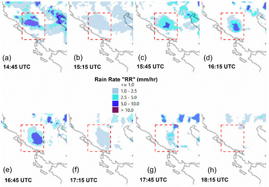 Case study analysis used for testing the accuracy of the satellite-based algorithm to provide accurate rain rate estimations. (a–h) Rain rate estimations of the satellite-based algorithm over the greater Epirus region (red dashed rectangle).