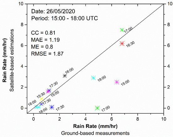 On the same day (26 May 2020), the network of the meteorological stations recorded 13 different RR measurements during the examined period (Figure 7). At this point, it is noted that only RR values larger than 0.3 mm/h were taken into account because—as proven previously—this threshold value is the most suitable for discriminating rain/no rain values. The correlation of the RR estimations and the rain-gauge measurements is given in Figure 7. The statistical metrics for this case study (MAE, ME, RMSE and CC equal to 1.19, 0.8, 1.87 mm/h and 0.81, respectively) confirmed the satisfactory accuracy of the satellite-based algorithm and its ability to capture significant rainfall events in the study area. It is also mentioned that the statistics of the examined case study are of the same magnitude and are very close to the relative statistics that came from the quantitative analysis (Table 5).