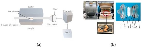 Laboratory samples simulating IST and ICS burning were used to confirm the PM chemical composition originating from ICS and IST and to evaluate the difference between the ICS and IST products used in Mali and Japan. Various brands of ICS and IST (mosquito coils) were burned in a tube furnace, and the emitted PM was sampled using a NILU filter holder system similar to that used in situ. The system consisted of a pump (APN-P215MV-1, Iwaki Co., Ltd., Tokyo, Japan), a flowmeter (DC-5, Shinagawa Co., Ltd., Tokyo, Japan), an NILU filter holder (47 mmφ), a quartz tube (70 cm length and 2.2 cm inner diameter), a tube furnace, and a temperature control unit (DSM83, Shimaden Co., Ltd., Tokyo, Japan). Twenty-two samples were collected. Approximately 1–2 g of ICS or IST sample was placed in a quartz sample boat (45 mm × 20 mm × 9 mm), which was set at the center of the quartz tube. The ICS and IST burning experiments were conducted in a closed system setting (closed-face inlet) at a flow rate of approximately 3 L/min and temperature varying between 350 and 450 °C. At the inlet of the quartz tube, indoor air was introduced through a silica gel tube, purafil tube, and active charcoal tube to purify the air. The burning particles were collected on quartz (2500QAT-UP, Pall Co., New York, USA) or PTFE filter (T080A047A, Advantec Toyo, Ltd., Tokyo, Japan) in the filter holder (Figure 1).