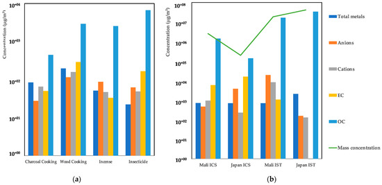 Figure 2 shows the PM constituent and mass concentrations for different emission sources. The filters were weighed before sampling in the laboratory, in contrast to the in-situ sampling. Therefore, the mass concentrations of TSP are not shown in Figure 2a. Figure 2a illustrates the mass concentrations of the different PM constituents in the samples collected from household microenvironments in Bamako City. IST presented the highest PM concentration, followed by cooking using wood fuel, ICS, and charcoal fuel. Figure 2b presents the PM constituents, mass concentrations, and mass concentrations of TSP in ICS and IST samples collected in the laboratory. The mass concentration of TSP was highest for the Japan IST, followed by the Mali IST, Mali ICS, and Japan ICS. Figure 3a,b show the contribution of the PM constituents in the samples collected in situ and in the laboratory, respectively. Carbonaceous compounds, especially OC, were the dominant constituents of all the samples. Although carbonaceous matter had the highest contribution, a visible difference was observed in the distribution of PM constituents for different emission sources. The distributions of ionic compounds, carbonaceous elements, and metallic elements are discussed in the following sections.