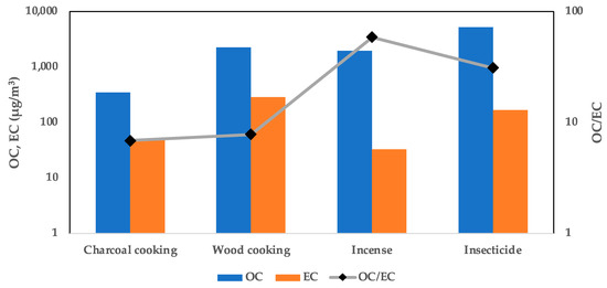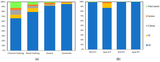 OC accounted for the largest fraction of carbonaceous substances in the households. The largest contributions occurred during the combustion of ICS and IST (96 and 75 wt%). The OC in PM collected from charcoal and wood cooking were 75 and 74 wt%, respectively. This suggests that although emission sources differed, they had the common characteristic of containing highly volatile carbonaceous compounds. Similarly, OC was the dominant carbonaceous material in the simulated combustion experiments. EC represented 10 wt% of Japanese ICS but was negligible in Malian ICS. The contribution was 1 wt% in the Mali ICS after the addition of charcoal. This suggests that charcoal might be among the ingredients used in Japanese ICS, in contrast to Mali ICS. Charcoal is a common ingredient in various Japanese ICS sticks [31,43,44]. The EC was negligible in all IST products.
