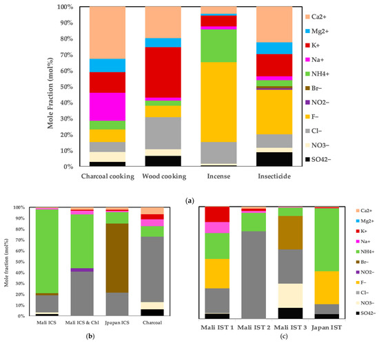 Both Malian and Japanese ICS were significantly loaded with 16 mol% and 22 mol% Cl−, respectively (Figure 4a). Cl− was identified as among the main compounds in different ICS samples [31]. The dominant species in the Malian ICS was NH4+ (77 mol%) (Figure 4b). The contribution of NH4+ (Figure 4a) in the in-situ samples was significantly lower (21 mol%). After mixing the samples with charcoal, the contribution of NH4+ ions decreased to 50 mol% and that of Cl− increased from 16 to 41 mol%. The simultaneous combustion of ICS and charcoal might have decreased the quantity of combusted ICS samples, resulting in a decrease in NH4+ compared to the combustion of only ICS. The addition of charcoal might have increased the contribution of Cl−. In fact, charcoal is dominated by Cl−. Japanese ICS showed a different ionic composition with a dominance of Br− ions (63 mol%) reported from biomass burning [32,33]. This was followed by Cl− (22 mol%) and NH4+ (11 mol%). The ionic contribution was different for different IST brands, but Cl− and NH4+ were detected in all samples. Cl− had a larger contribution to the Malian IST, while NH4+ had a larger contribution to the Japanese IST. This has been previously detected in biomass combustion [24,34,35]. They may have been produced from the ICS and IST biomass content. Br− was detected only in Mali IST3 and contributed significantly (30 mol%).