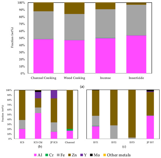 Figure 6 shows the average weight fraction of the metallic elements in the different PM samples. In general, the same constituents of major elements were detected for the four emission sources with slightly different distributions. Al and Fe were the dominant constituents of all emission sources, with ICS and charcoal cooking presenting the highest contribution. Al and Fe are dust tracers but have been detected in previous studies during biomass combustion and cooking fumes [56]. Similarly, Zn was detected in all the emission sources. Other trace elements, such as Mn, Rb, and Ba, had negligible contributions and are represented by other metals, as shown in Figure 6a.