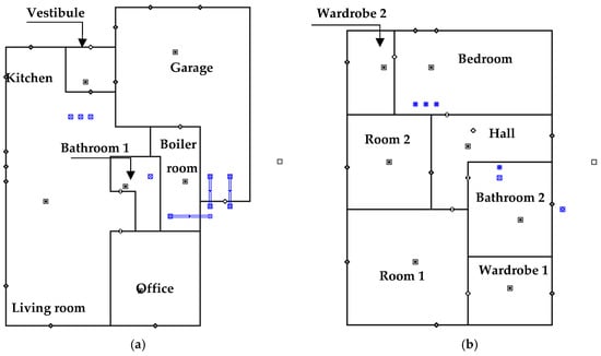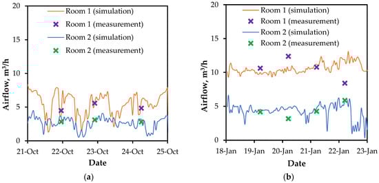 4] built the passive building model with HVAC (heating, ventilation, air conditioning) systems using TRNSYS, which was validated on the measurement results covering two weeks in winter for nine rooms. The measurement campaign included the indoor temperature, energy used for heating, and measurement of the absolute humidity of the exhausted air. Similar results of air temperature were obtained, with the average difference equal to 0.02 K. The authors indicated a strong dependence of obtaining reliable results of temperature on the exact determination of heat gains. The greatest difference was obtained in the toilet zone, where a precise determination of small heat gains was relatively difficult. The difference between the measured and simulated results was 0.03 g/kg. The third verification relied on a comparison of the change in capacity of the heating coil; the error was equal to 3.5%. The authors found high reliability of the numerical model, including the indoor environment, and the models of the ventilation and air heating system. The work by Coakley et al. [