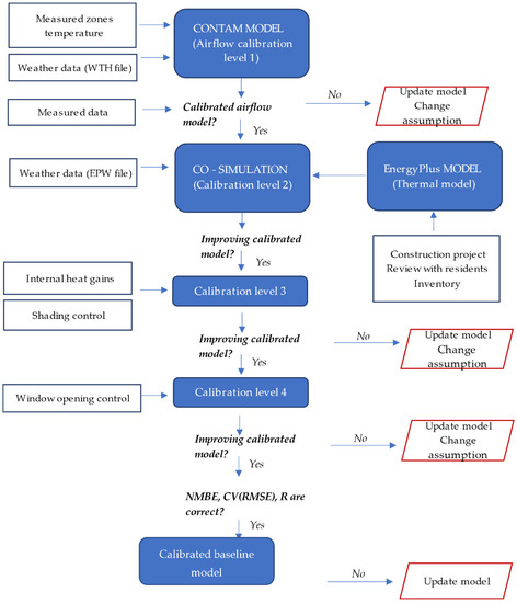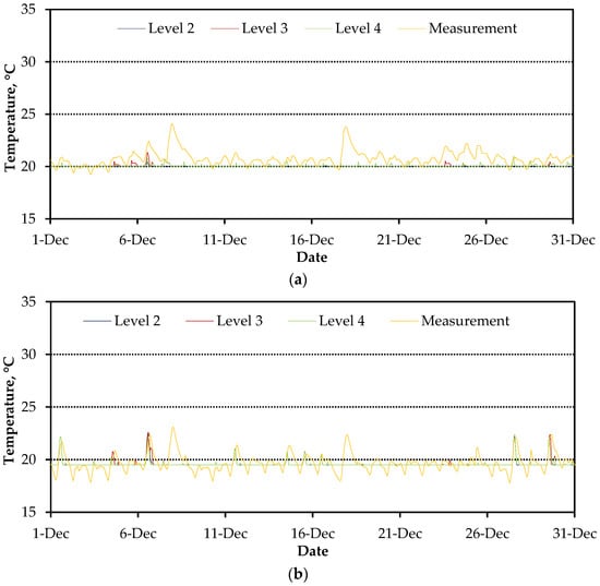 20], verification of an office building model to co-simulation was conducted on the basis of the measurement of one year’s energy use and the pollutant concentrations for two weeks. In this study, the measurement validation of simulation results was described and discussed. Four calibration levels for the model were presented and validation was performed for one-year results of the indoor temperature and ventilation airflow. In previous studies, validation was usually performed for shorter periods. Calibration of the residential building models is also more problematic compared to office buildings due to the difficulty defining the variability in the internal heat gains over a long period of time.