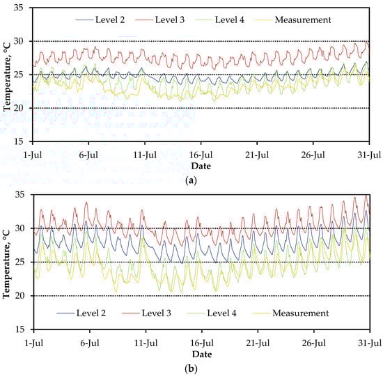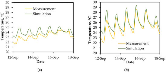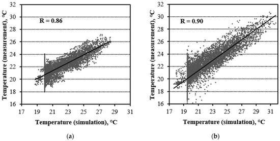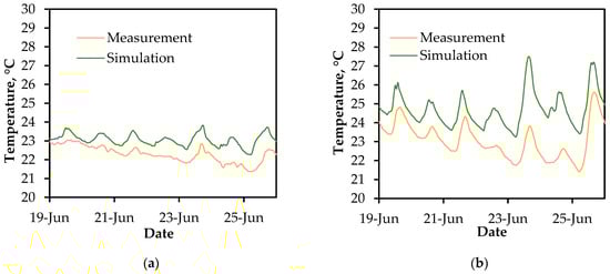 6] conducted empirical validation of the commercial buildings during the cooling season, aimed at the improvement and development of BEM tools such as EnergyPlus. The main simulation modules, such as the main heating, ventilation, and air conditioning (HVAC) system and the infiltration model, were only validated (without calibration) based on actual experimental in situ data. The measured data included airflow infiltration and ventilation rates, electricity consumption for cooling, delivered cooling energy consumption, fans’ electricity consumption, and zone air temperature. The as-built drawings were used to create the numerical model in EnergyPlus. A comparison of the hourly values showed large discrepancies in the results of the existing default infiltration models (initially CV (RMSE) was equal to 180.5%), high correlation (0.9) for the electricity consumption for cooler units, and good identification of the indoor temperature (maximum deviation of air temperature was 0.79–1.14 °C) and total electricity (deviation was 1.3%–1.4%). In turn, in work by Ogando et al. [