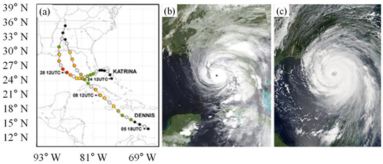 The track and intensity of Hurricanes Dennis and Katrina. The symbols shown in (a) were plotted every 6 h and the colors denote storm intensity categories on the Saffir–Simpson scale (category 1, green; category 2, light green; category 3, yellow; category 4, dark orange; category 5, red). (b) and (c) are images of Dennis and Katrina at their peak intensity on 10 July and 28 August 2005, respectively.