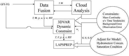 The following three steps were generally performed in the HLAPS (Figure 2): (1) a two-dimensional (2D) terrestrial analysis and 3D analysis of temperature (T), geopotential height (), wind components (u, v, ), relative humidity (RH), cloud water (qc), cloud ice (qi), cloud rainwater (qr), and cloud snow (qs); (2) diagnosis of dynamic constraints using the minimum cost function at all grid points following Equation (1) and (3) adjustment of hydrometer concentrations to a saturation condition.