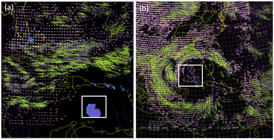 Observation data obtained by NOAA aircraft were also used in this study, i.e., actual observation data from a Hurricane P3 aircraft. The type of data collected differed slightly depending on the aircraft flying time. Figure 3 shows the distribution of all types of data collected for Hurricanes Dennis and Katrina. Figure 3a shows Hurricane Dennis, in which radial velocity was observed within a 2 h window from 21:00 on 5 July 2005. Figure 3b shows the distribution of the observed data in the case of Hurricane Katrina; the data were collected from dropsondes dropped from an aircraft within a 2 h window from 18:00 on 27 August 2005. These observation data were assimilated into the initial field of the model.