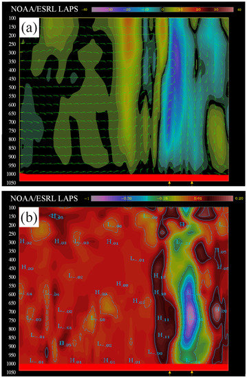 Figure 4 and Figure 5 show the initial state assimilated with the HLAPS for the two hurricane cases. The results shown in these figures were compared with the vertical and horizontal structures of the hurricanes after the DA. Figure 4a shows the vertical features of Hurricane Dennis’s circulation in a storm stage. Here, the most important consideration was whether the Doppler radar and dropsonde winds were able to correct for the surrounding field in the HLAPS. The results show Storm Dennis up to the upper troposphere. Updrafts with negative omega were observed around the storm, and downdrafts with positive omega were identified. These vertical circulations represent the growing storm. Figure 4b shows the difference in geopotential height perturbations between the background and analysis fields after assimilation with the HLAPS. When the static equation was combined with the gas state equation, the geopotential height was proportional to the temperature. Thus, the storm warmed up to a maximum of 0.7 °C near 750–850 hPa. The dashed lines in the geopotential height perturbation differences were identified as a negative value of 0.1 m.