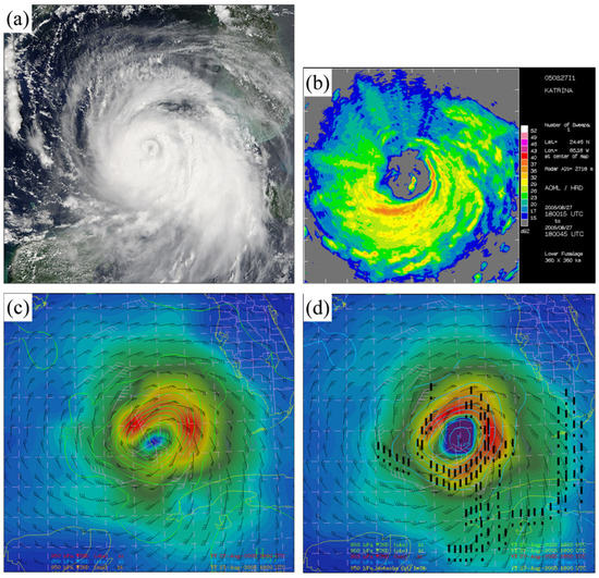 Hurricane Katrina was also a very intense TC that caused severe damage. This hurricane lasted from 23 August to 30 August 2005 and had several landfalls; a detailed description is provided by Knabb et al. [29]. The system evolved as a depression over the southeastern Bahamas on 23 August 2005. The depression then intensified into a category 1 hurricane on the southeastern coast of Florida at around 22:30 UTC on 25 August. As this system moved from west to north, values of 902 hPa and 77 m s−1 were recorded at 18:00 UTC on 28 August. Katrina intensified to a category 5 hurricane as it moved across the Gulf of Mexico. It exhibited category 3 intensity near the mouth of the Pearl River at the Louisiana/Mississippi border at 11:10 UTC on 29 August.
