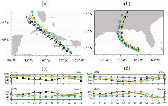The 72-h forecast track (a,b) and intensity (c,d) for Hurricane Dennis (a,c) and Hurricane Katrina (b,d), according to the best-analyzed observation (Best), Global Forecasting System (GFS), Hurricane Research System (HRS), and HRS coupled with the Hurricane Local Analysis Prediction System (HRS/HLAPS). The black, blue, green, and yellow colors represent the Best, GFS, HRS, and HRS/HLAPS models, respectively. Symbols are plotted every 6 h.