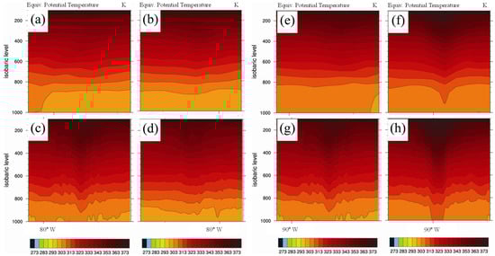 Cross-sections showing the equivalent potential temperature (K) of the TC according to (a,c,e,g) 24 and (b,d,f,h) 48 h forecasts taken from the GFS (upper panels) and HRS/HLAPS (lower panels). The left and right panels are for Hurricanes Dennis and Katrina, respectively.