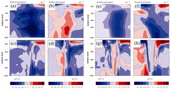 The cross-sections indicate that the TC intensification was greater with a 48-h lead time compared to that of a 24 h lead time, as shown in Figure 6. At a 24 h lead time, Hurricane Dennis was under development and grew slightly by a 48-h lead time (Figure 8a–d). Hurricane Katrina has already developed and extended to full altitudes between 24 h and 48 h (Figure 8e–h). The cross-section of the equivalent potential temperature and radial winds in the 48-h forecast field revealed weakened subsidence (Figure 9d) and a decrease in the inward flows (Figure 10d), respectively. This was conducted as vortices in the lower layer decreased due to increased roughness and decreased moisture in the lower layer (Figure 8d). The latent heat decreased as Hurricane Dennis approached Cuba (Figure 6). Lower boundary forcing had a greater effect on the TC intensity than the initial and lateral boundary forcing. Conversely, Hurricane Katrina grew stronger and the vortex at its center strengthened, while the warm core became more pronounced. The forecast shows reasonable accuracy in terms of TC track and intensity (Figure 6).