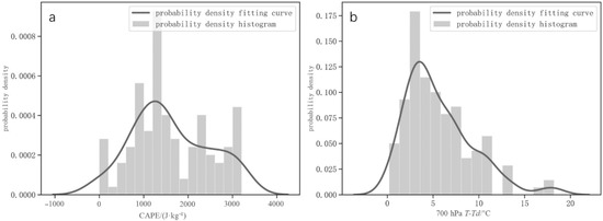 Probability density distribution and fitting curve of physical quantities (a). CAPE, (b). 700 hPa T−Td) in weather situation of FRO_T.