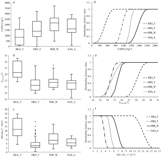 Boxplots (a–c) and the corresponding membership function (d–f) of physical quantities in the four types of weather situations. (a,d) are the boxplots and the corresponding membership function of CAPE in the four types of weather situations. (b,e) are the boxplots and the corresponding membership function of T850-500 in the four types of weather situations. (c,f) are the boxplots and the corresponding membership function of 850 hPa T−Td in the four types of weather situations. In boxplots, the ○ at the top or bottom represents the outliers, and the short line at the top and bottom represents the maximum and minimum value (excluding outliers). The three lines from top to bottom of the box are the 75% percentile, the median and the 25% percentile respectively.