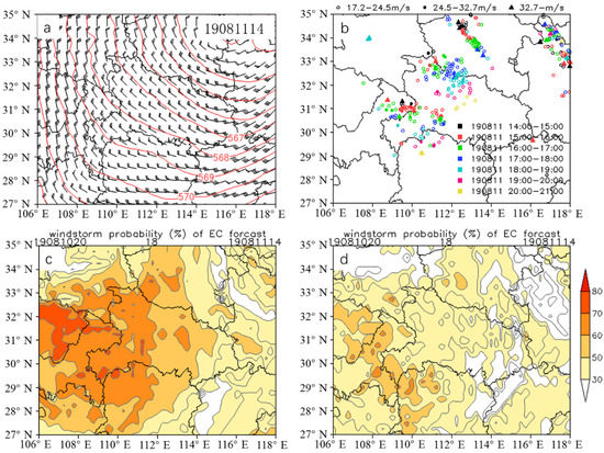 Same to Figure 5 but for a PER_W thunderstorm gale on 20 August 2020: (a) Geopotential height (contours; dagpm) and wind field (vectors; m∙s−1). The number 20082014 in the upper right corner represents 14:00 on 20 August 2020. (b) The evolution of the surface wind speed ≥ 17.2 m∙s−1 in the case. Different colors indicate different times, circles indicate wind speed between 17.2 and 24.5, dots indicate wind speed between 24.5 and 32.7, triangles indicate wind speed above 32.7. (c) Forecast results based on the PPCP. The number in the upper left corner indicates the running time, and the number in the upper right corner indicates the forecast time. (d) Forecast results based on the PPB.