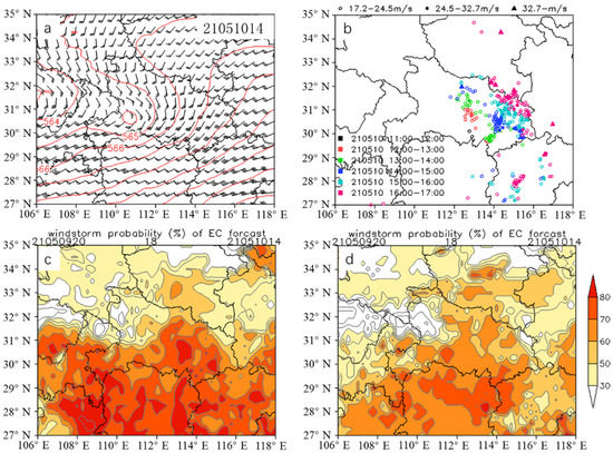 Same to Figure 5 but for a FRO_T thunderstorm gale on 10 May 2021: (a) Geopotential height (contours; dagpm) and wind field (vectors; m∙s−1). The number 21051014 in the upper right corner represents 14:00 on 10 May 2021. (b) The evolution of the surface wind speed ≥ 17.2 m∙s−1 in the case. Different colors indicate different times, circles indicate wind speed between 17.2 and 24.5, dots indicate wind speed between 24.5 and 32.7, triangles indicate wind speed above 32.7. (c) Forecast results based on the PPCP. The number in the upper left corner indicates the running time, and the number in the upper right corner indicates the forecast time. (d) Forecast results based on the PPB.