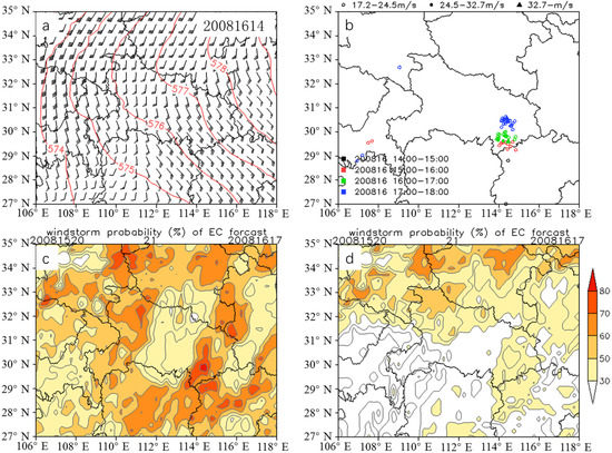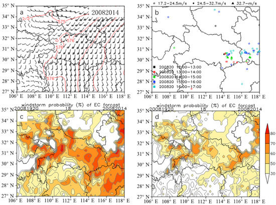Same to Figure 5 but for an EAS_A thunderstorm gale on 16 August 2020 (a) Geopotential height (contours; dagpm) and wind field (vectors; m∙s−1). The number 20081614 in the upper right corner represents 14:00 on 16 August 2020. (b) The evolution of the surface wind speed ≥ 17.2 m∙s−1 in the case. Different colors indicate different times, circles indicate wind speed between 17.2 and 24.5, dots indicate wind speed between 24.5 and 32.7, triangles indicate wind speed above 32.7. (c) Forecast results based on the PPCP. The number in the upper left corner indicates the running time, and the number in the upper right corner indicates the forecast time. (d) Forecast results based on the PPB.