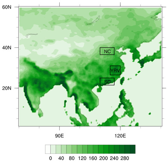 The 95th percentile (mm) of the distribution for 14-day precipitation totals from 1980 to 2019. The three regions (a) North China (NC), (b) Yangtze River Valley (YRV) and (c) South China (SC) of study for the Eastern China are delineated by the black-outlined polygons.