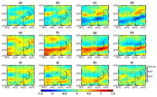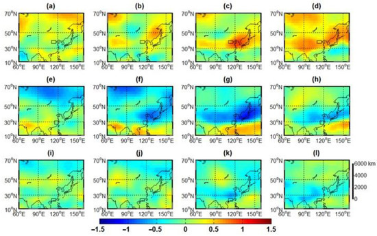 As in Figure 6, but for 200-hPa zonal winds. (a–d) North China (NC), (e–h) Yangtze River Valley (YRV), and (i–l) South China (SC).
