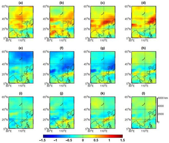 Composite of 500-hPa geopotential-height standardized anomalies for lagged windows of −10 to −6 (first column), −5 to −1 days (second column), 1 to 14 days (third column), and 15 to 21 days (forth column). Each row represents a region (Small black rectangular in the figure), from top to bottom, NC, YRV, and SC. (a–d) North China (NC), (e–h) Yangtze River Valley (YRV), and (i–l) South China (SC).