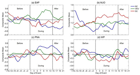(c) By means of synthetic analysis, i.e., the day-by-day standardized anomalies of different variables are synthesized and then the geopotential use of synthetic modes in advance prediction is investigated. The role of several atmospheric teleconnection patterns in PEPEs is also examined. There are four main teleconnection patterns that were discussed in our studies, including the East Asia-Pacific pattern (EAP) [41], Madden–Julian Oscillation (MJO) [42], Pacific-North America (PNA) [43], and Western Pacific (WP) [43]. The aim is to give clear precursor signals for the diagnosis of PEPEs and to learn more about the actual predictability of these events.