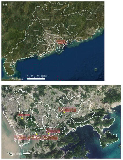 The geographical location of the Pearl River Delta region in China (a) and the research station in Shenzhen (b) (marked as yellow dot).