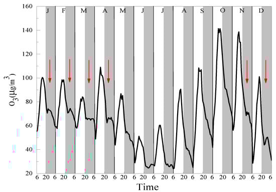 Daily variation in O3 concentrations in individual months of 2020. Gray indicates nighttime.