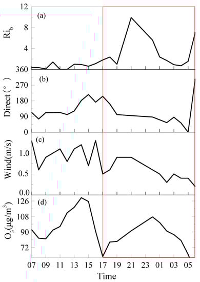 Characteristics of the variation in the bulk Richardson number (Rib) (a), wind direction (b), wind speed (c), and O3 concentration (d) from 8 to 9 April 2020.