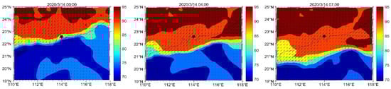 Figure 6a shows that the O3 concentration during the nighttime between 00:00 and 06:00 on 14 March 2020 rose from 14 μg/m3 to 40 μg/m3. Figure 7 shows the spatial distribution of ozone concentration and horizontal wind vector at the 950 hpa level. It can be seen from Figure 7 that under the condition of the prevailing north wind, the air mass in the high O3 area was gradually transported to seashore land during the period of 00:00 to 07:00 on 14 March. At the same time, a low–level jet occurred (Figure 6b), which further facilitated the O3 inland to be transported to the coastal areas. A wind profiler radar recorded the evolution of the vertical profile of wind speed on the night of 14 March (Figure 6b), and an obvious low-level jet appeared during the period of 02:00 to 06:00. The maximum wind speed of the low-level jet was recorded at the height of 400–700 m, reaching 15 m/s. During this period, vertical mixing might have been enhanced within the surface layer due to the strong vertical shear of wind speed, resulting in an increase in surface O3 concentration []. Based on this inference, the vertical distribution of O3 concentration during this period was further analysed in Figure 6c. A significant decrease in O3 concentration at 0.4–1.0 km and an increasing tendency in the lower atmospheric layers can be found, which indicates that the LLJ may enhance the vertical mixing of mass within the boundary layer. Furthermore, it can be seen from Figure 6d that the TKE within the surface layer increased rapidly from 02:00 to 07:00, reaching a maximum of 2.5 m2/s2, which was further evidence that the LLJ enhanced vertical turbulent mixing. Therefore, LLJs might promote the enhancement of vertical mixing and increase the ground-level O3 concentration at night.
