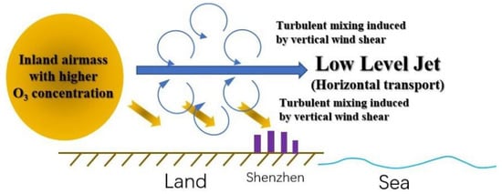 Therefore, the entire night O3 pollution event can be explained by Figure 8, during which the LLJ played an important role. In the horizontal direction, the LLJ efficiently transported the inland airmass with rich O3 to the coastal areas. At the same time, due to the strong vertical shear of wind speed caused by LLJ, the turbulence in the surface layer was enhanced, so that the O3 at high altitudes was delivered to the ground through vertical exchange.