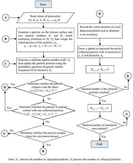 In the Monte Carlo simulations, the initial position of the individual approaching particle on the “release surface” located above the filtration medium was first assigned using a random number with a uniform deviation between 0 and 1 (see Figure 1). Once released, the particle was allowed to move in any of six directions in terms of the motion probabilities determined by Equation (9) at a given Pe, and thus its trajectory could be determined. The knowledge of the particle’s trajectory, in turn, determined whether or not a given particle would be deposited and, if so, the deposition position. If a particle migrated outside the simulation domain in the x and z direction, it re-entered on the opposing side at the same height (i.e., periodic boundary conditions). If a particle migrated through the fiber layer, it was discarded from the simulation and a new particle was released. This procedure was repeated until the number of the deposited particles reached a preset value. A more detailed description of the simulation procedure can be seen in the flow chart (Figure 2).