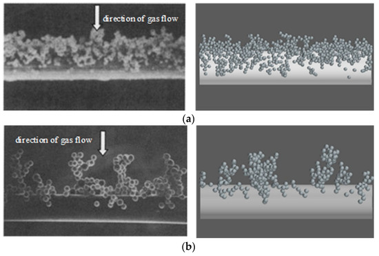 The numerical model used in this study was validated against the experimental observations given by Kanaoka et al., and Bhutra and Paratakes [47,48], and the results are shown in Figure 3. The conditions under which the simulations were made were identical to those used in the deposition experiments, and the specific parameters were as follows: (a) Case 1: u = 0.5 m/s, dp = 1 µm, df = 10 µm, ρp = 11.34 g/cm3, fiber length Lf = 50 µm, number of the deposited particles NC = 800; (b) Case 2: u = 0.3 m/s, dp = 3.3 µm, df = 25 µm, ρp = 0.66 g/cm3, fiber length Lf = 125 µm, NC = 300. The packing density of the fibrous filter was set to 0.001 (as an approximation of an isolated fiber used in the experiments) for both cases. For Case 1, the inertial effect of particles was significant due to their high density; the incoming particle moved almost in a straight-line trajectory until it contacted the fiber, and the effect of the flow field around the fiber on the particle’s motion was negligible. However, for Case 2, the particle moved toward the fiber almost along the flow streamline due to the very low density; this case corresponded to the limiting condition of Pe→0, i.e., a purely convective transport mechanism. In a comparison of the simulation experiments, the straight-line and streamline trajectories were therefore applied for particle motion for Cases 1 and 2, respectively. Figure 2 shows that fairly good agreement on the morphology of particle deposition was obtained between the simulations and the experimental observations. The verifications confirmed that the proposed stochastic simulation model was capable of simulating particle deposition and then providing the particle deposition morphology. In addition, a comparison of the deposit morphologies between Case 1 and Case 2 suggested the possibility of the strong effects of the transport mechanism on the morphology of the deposits on the fibers’ surface. This will be discussed in the next section in detail.
