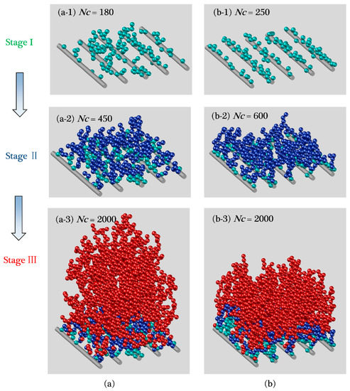 Figure 4 indicates that the process of particle deposition can be characterized as occurring in three stages, namely the particle adhesion stage (Stage I), the dendrite growth stage (Stage II) and the dust cake growth stage (Stage III). During Stage I, the particles were deposited directly on the fibers’ surface, and acted as a new collection point for the deposition of subsequent particles. Following this, a dendritic (or chain-like) particle deposit formed and grew until it interacted with the particle dendrites on the adjacent fibers, eventually forming a porous network-like structure. Finally, the particle deposition process entered the filter cake growth stage. This stage was characterized by the fact that the particles were completely captured by the previously deposited particles, whereas the fiber almost lost the capacity to collect approaching particles.