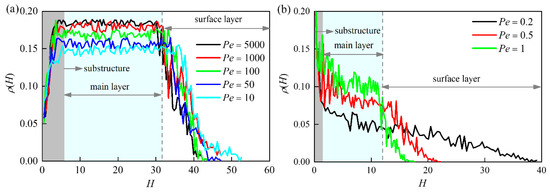 The spatial distributions of the packing densities of dust layers under different Pe numbers are given here to observe the pore structure characteristics of the dust layers in detail. The calculation results are shown in Figure 6. The abscissa in the figure represents the dimensionless dust layer’s thickness, H, which is defined as the ratio of the thickness of the dust layer to the particle diameter dp.