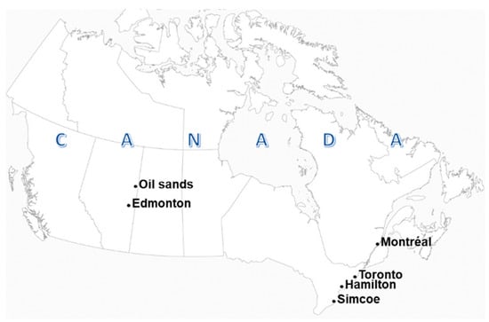Time-integrated PAC samples were collected at five National Air Pollution Surveillance (NAPS) monitoring sites located in Montréal (MTL), Toronto (HWY401), Hamilton (HMT), Simcoe (SIM), and Edmonton (EDM) as shown in Figure 1. The sampling site located in the Athabasca oil sands area (57°01′36.7″ N; 111°30′03.0″ W; AMS11) was chosen for comparison; this industrial site is influenced by bitumen mining and petroleum processing emissions [16].