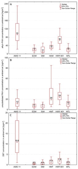 Figure 2A,B show the spatial median concentrations of alkyl-PAHs and unsubstituted PAHs at all sites; summary statistics for PAC (gaseous + particulate) compositions (PAHs, alkyl-PAHs, DBTs) are summarized in Tables S4–S9 (Supplementary Information). Amongst the NAPS sites, the highest median concentration (65 ng/m3) of alkyl-PAHs was observed at the HWY401 site located close to the major highway 401. As previously reported [16,17] and shown in Figure 2A, elevated concentrations of alkyl-PAHs in the Oil Sand Region (AMS11) represent the influence of regional petrogenic sources associated with exploitation/mining and processing of fossil fuels. Thus, the observed elevated concentrations of alkyl-PAHs at the HWY401 site may indicate the contribution of traffic emissions associated with combusted fossil fuels. At other NAPS sites, alkyl-PAH levels were considerably lower with median concentrations ranging from 12 to 30 ng/m3. As shown in Figure 2B, the most elevated levels of unsubstituted PAHs were also observed at the HWY401 (median = 24 ng/m3) followed by Hamilton (median = 20 ng/m3). The higher levels of PAHs in Hamilton, as compared to urban sites in Montréal and Edmonton, suggest impacts from additional sources other than traffic, such as PAH emissions originating from nearby steel industries [51,52,53].