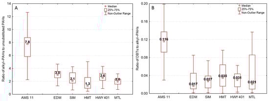 Ratios of (A) alkyl-PAHs/PAHs and (B) DBTs/alkyl-PAHs at the five NAPS sites and the industrial-petrogenic AMS11 site for comparison [16].