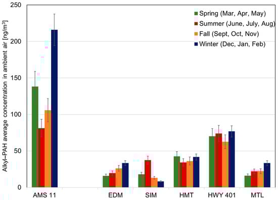 Seasonality effects of alkyl-PAH by site for 2015–2016 period; the data from the AMS11 site are reported for comparison [16].